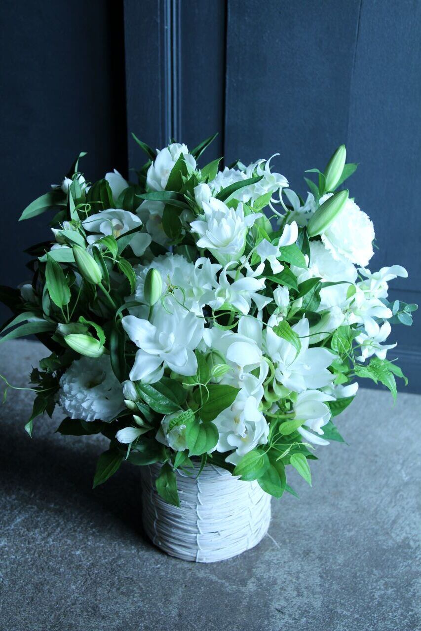 故人を偲ぶアレンジメントです。心安らぐ花の彩りは、厳かな気持ちを表現します。大切な方への追悼の意を込めた贈り物や、自宅でのお供えに最適です。